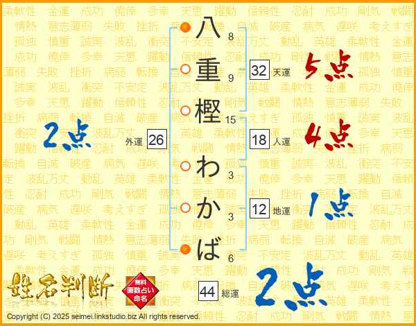 生活面を象徴する運勢です。外部から受ける影響力を表し、結婚運、家庭運や職場、環境への順応性を表します。総運から人運を引いた画数。姓や名が1文字の場合を除く。