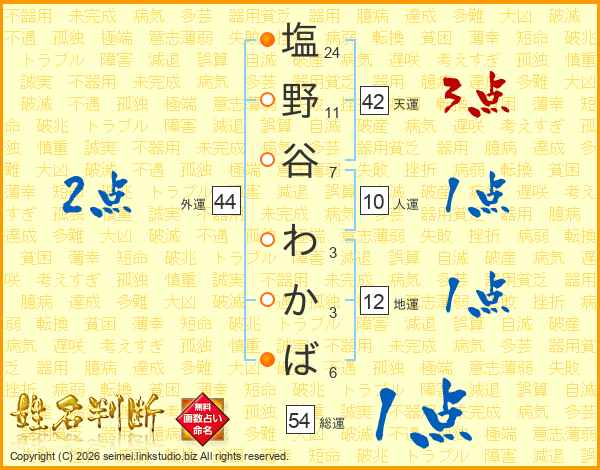 塩野谷わかばさんの総運は54画の1点!