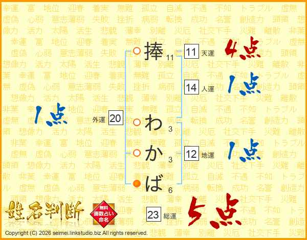 生活面を象徴する運勢です。外部から受ける影響力を表し、結婚運、家庭運や職場、環境への順応性を表します。総運から人運を引いた画数。姓や名が1文字の場合を除く。