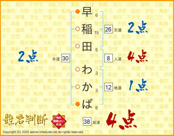 早(6画)稲(15画)田(5画) わ(3画)か(3画)ば(6画)
