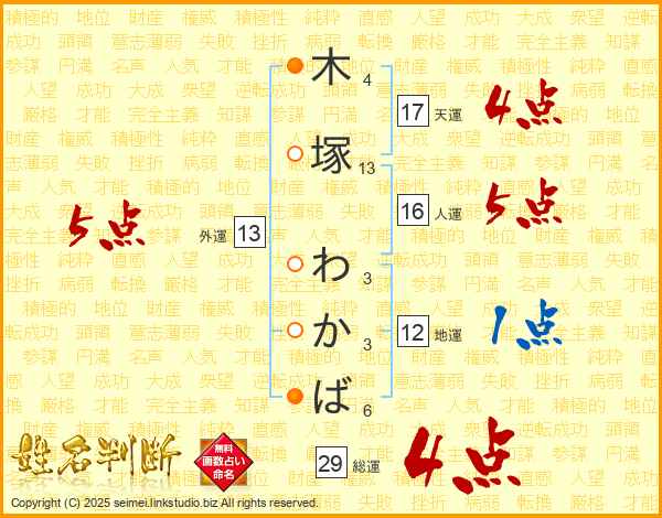 木(4画)塚(13画) わ(3画)か(3画)ば(6画)