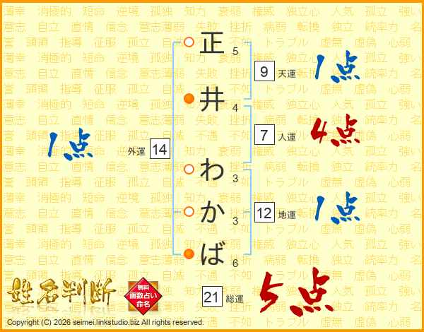 生活面を象徴する運勢です。外部から受ける影響力を表し、結婚運、家庭運や職場、環境への順応性を表します。総運から人運を引いた画数。姓や名が1文字の場合を除く。