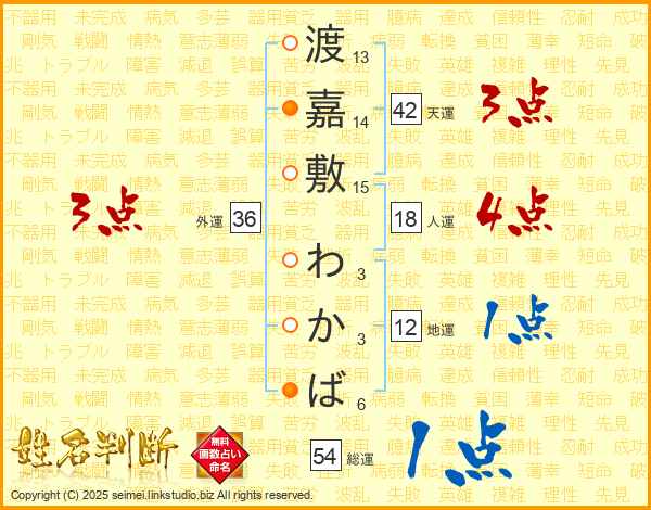 渡(13画)嘉(14画)敷(15画) わ(3画)か(3画)ば(6画)