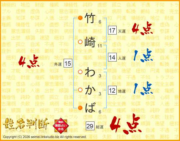 竹(6画)崎(11画) わ(3画)か(3画)ば(6画)