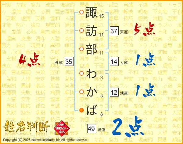 諏(15画)訪(11画)部(11画) わ(3画)か(3画)ば(6画)