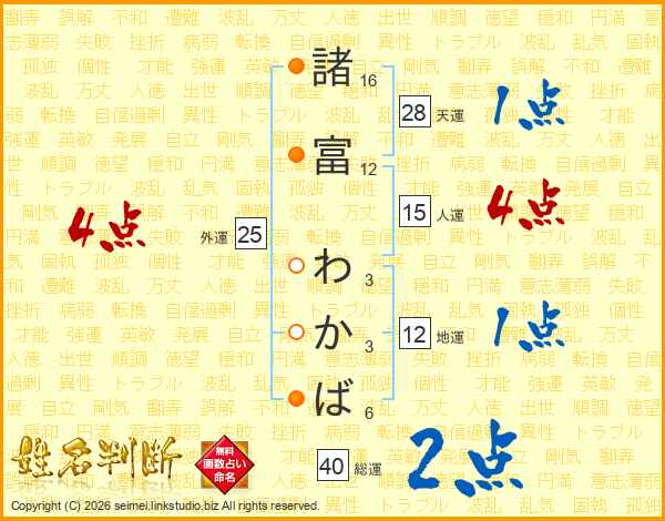 諸(16画)富(12画) わ(3画)か(3画)ば(6画)