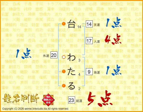 生活面を象徴する運勢です。外部から受ける影響力を表し、結婚運、家庭運や職場、環境への順応性を表します。総運から人運を引いた画数。姓や名が1文字の場合を除く。