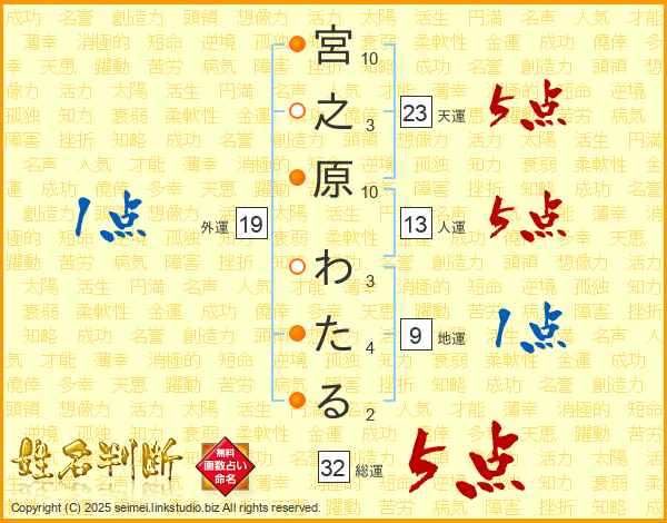 生活面を象徴する運勢です。外部から受ける影響力を表し、結婚運、家庭運や職場、環境への順応性を表します。総運から人運を引いた画数。姓や名が1文字の場合を除く。
