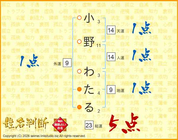 小(3画)野(11画) わ(3画)た(4画)る(2画)