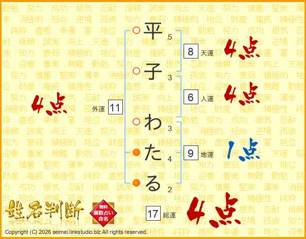 平子わたるさんの総運は17画の4点!