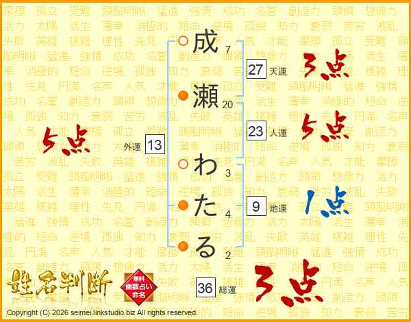 成瀬わたるさんの人運は23画の5点!