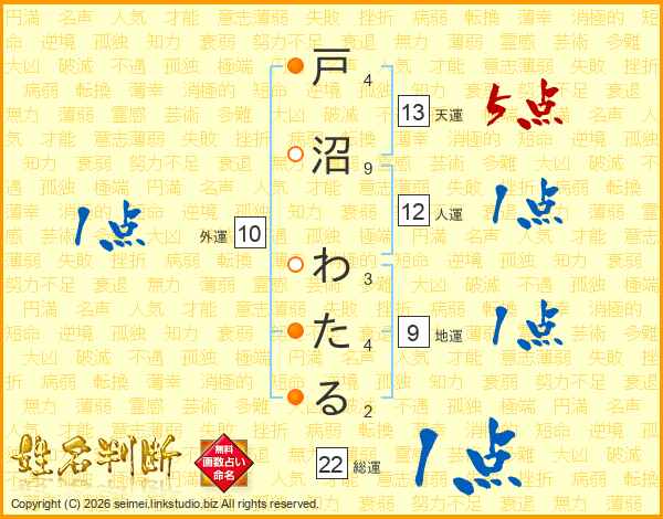 戸沼わたるさんの総運は22画の1点!