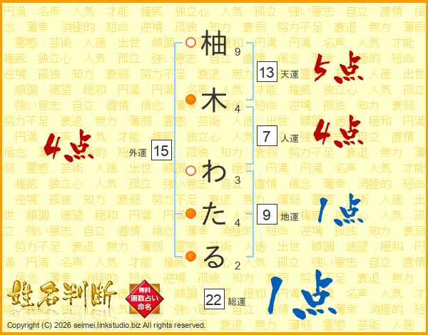柚(9画)木(4画) わ(3画)た(4画)る(2画)
