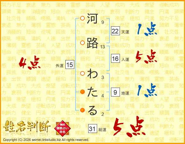 河路わたるさんの総運は31画の5点!