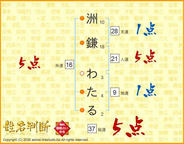 生活面を象徴する運勢です。外部から受ける影響力を表し、結婚運、家庭運や職場、環境への順応性を表します。総運から人運を引いた画数。姓や名が1文字の場合を除く。
