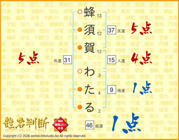 蜂須賀わたるさんの総運は46画の1点!