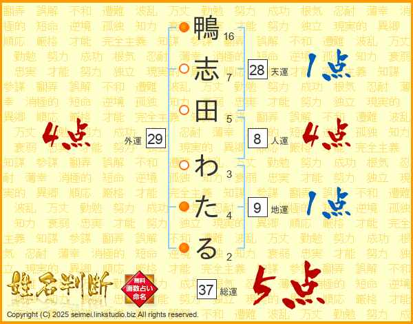 鴨(16画)志(7画)田(5画) わ(3画)た(4画)る(2画)