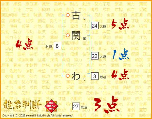 古関わさんの総運は27画の3点