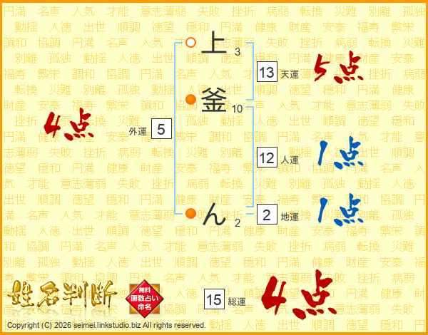 生活面を象徴する運勢です。外部から受ける影響力を表し、結婚運、家庭運や職場、環境への順応性を表します。総運から人運を引いた画数。姓や名が1文字の場合を除く。