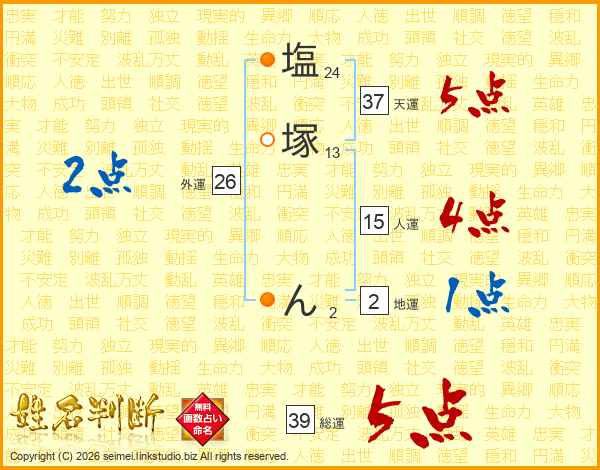 塩塚んさんの総運は39画の5点!