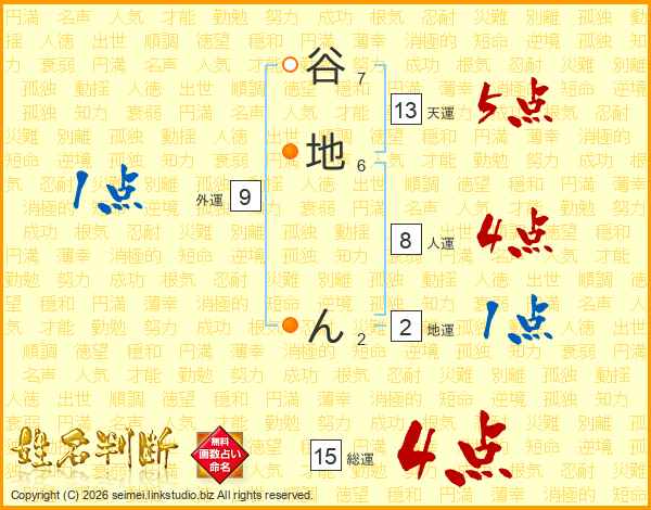 生活面を象徴する運勢です。外部から受ける影響力を表し、結婚運、家庭運や職場、環境への順応性を表します。総運から人運を引いた画数。姓や名が1文字の場合を除く。