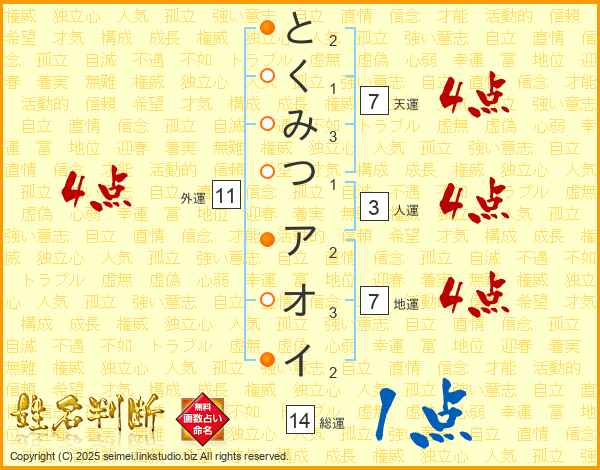 生活面を象徴する運勢です。外部から受ける影響力を表し、結婚運、家庭運や職場、環境への順応性を表します。総運から人運を引いた画数。姓や名が1文字の場合を除く。