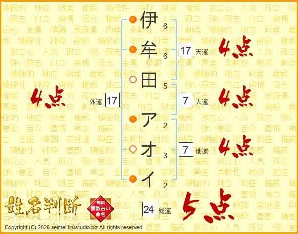 伊(6画)牟(6画)田(5画) ア(2画)オ(3画)イ(2画)