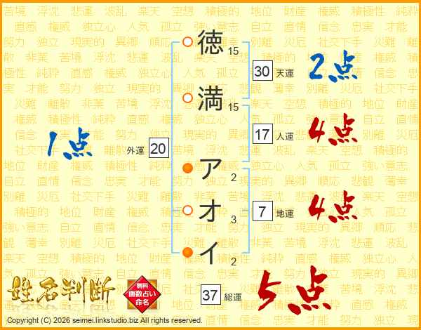 徳(15画)満(15画) ア(2画)オ(3画)イ(2画)