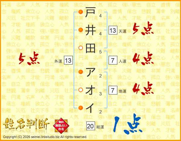 生活面を象徴する運勢です。外部から受ける影響力を表し、結婚運、家庭運や職場、環境への順応性を表します。総運から人運を引いた画数。姓や名が1文字の場合を除く。
