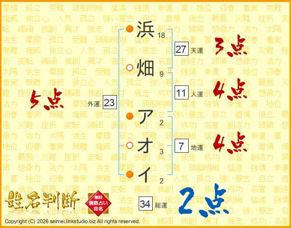 あなたの人生を表す1番重要な運勢です。生涯を通じて影響する総合運となり、主に50歳以降の晩年期に影響を及ぼします。苗字と名前の合計画数。