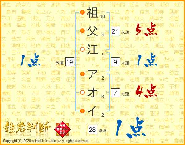 生活面を象徴する運勢です。外部から受ける影響力を表し、結婚運、家庭運や職場、環境への順応性を表します。総運から人運を引いた画数。姓や名が1文字の場合を除く。