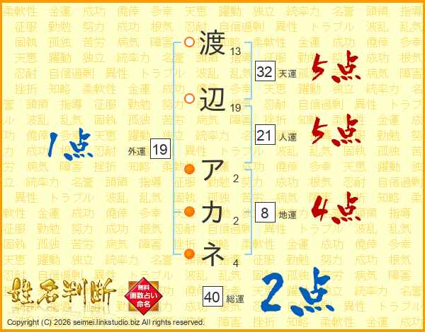 渡辺アカネさんの総運は40画の2点!