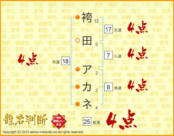 袴(12画)田(5画) ア(2画)カ(2画)ネ(4画)