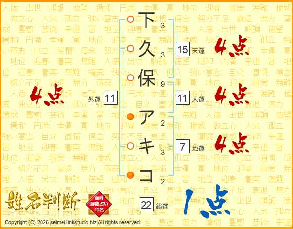 生活面を象徴する運勢です。外部から受ける影響力を表し、結婚運、家庭運や職場、環境への順応性を表します。総運から人運を引いた画数。姓や名が1文字の場合を除く。