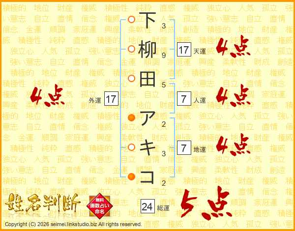 下(3画)柳(9画)田(5画) ア(2画)キ(3画)コ(2画)