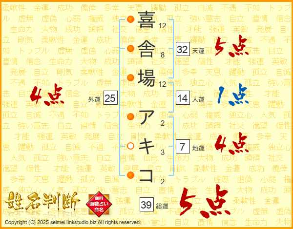 生活面を象徴する運勢です。外部から受ける影響力を表し、結婚運、家庭運や職場、環境への順応性を表します。総運から人運を引いた画数。姓や名が1文字の場合を除く。