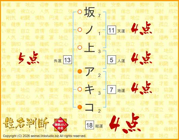 生活面を象徴する運勢です。外部から受ける影響力を表し、結婚運、家庭運や職場、環境への順応性を表します。総運から人運を引いた画数。姓や名が1文字の場合を除く。