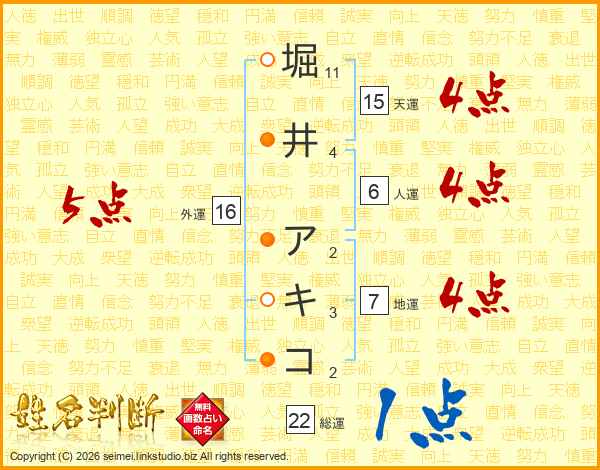 堀(11画)井(4画) ア(2画)キ(3画)コ(2画)