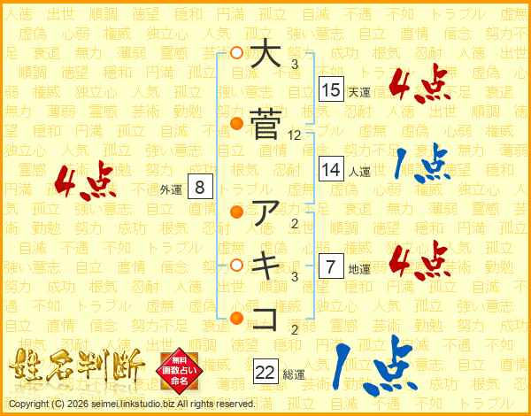 大菅アキコさんの総運は22画の1点!