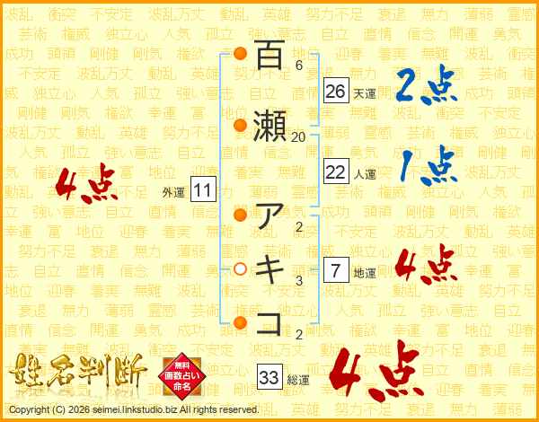 百(6画)瀬(20画) ア(2画)キ(3画)コ(2画)