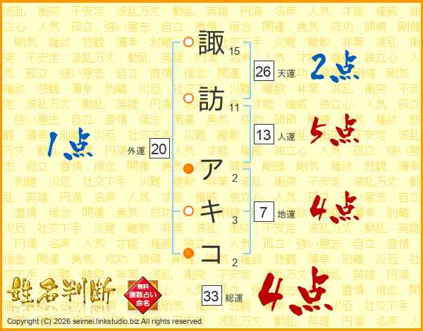 諏(15画)訪(11画) ア(2画)キ(3画)コ(2画)