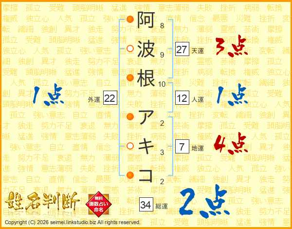 生活面を象徴する運勢です。外部から受ける影響力を表し、結婚運、家庭運や職場、環境への順応性を表します。総運から人運を引いた画数。姓や名が1文字の場合を除く。