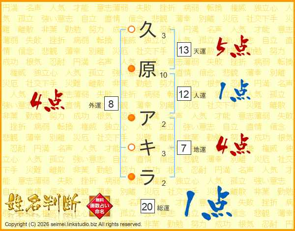 久原アキラさんの総運は20画の1点!