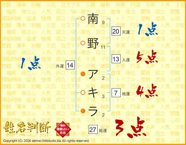 南野アキラさんの総運は27画の3点!