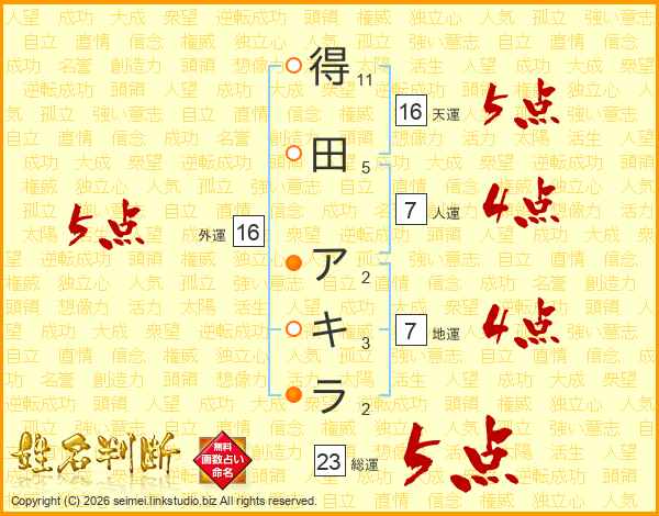 得田アキラさんの総運は23画の5点!