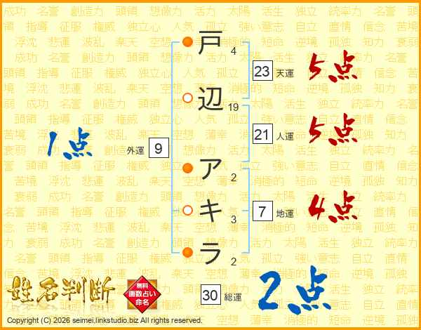 生活面を象徴する運勢です。外部から受ける影響力を表し、結婚運、家庭運や職場、環境への順応性を表します。総運から人運を引いた画数。姓や名が1文字の場合を除く。