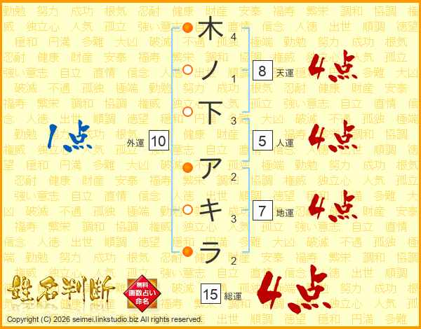 木(4画)ノ(1画)下(3画) ア(2画)キ(3画)ラ(2画)