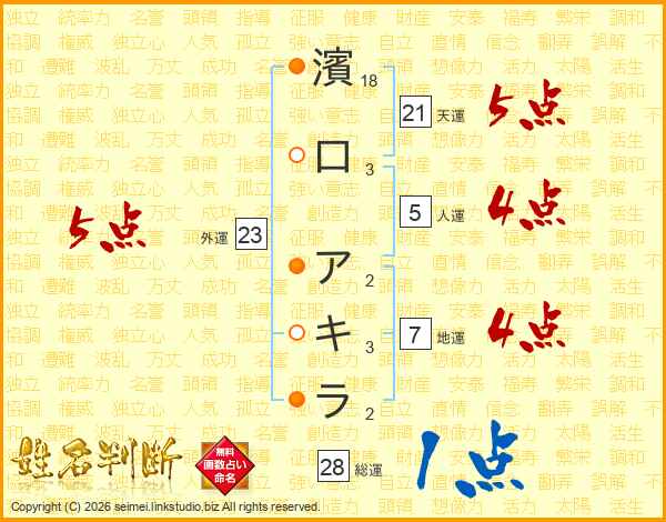 濱(18画)口(3画) ア(2画)キ(3画)ラ(2画)