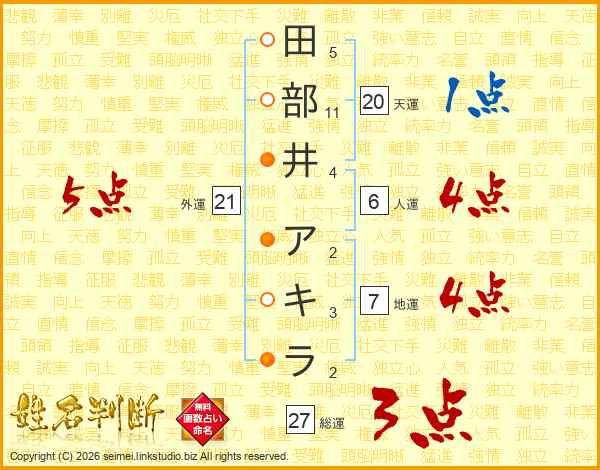 田(5画)部(11画)井(4画) ア(2画)キ(3画)ラ(2画)
