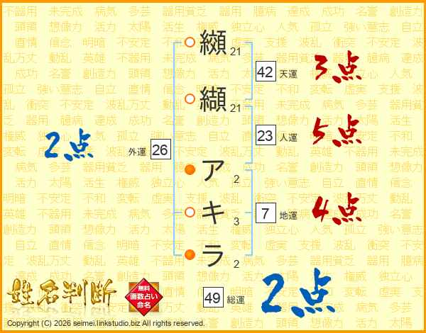纐纈アキラさんの総運は49画の2点!